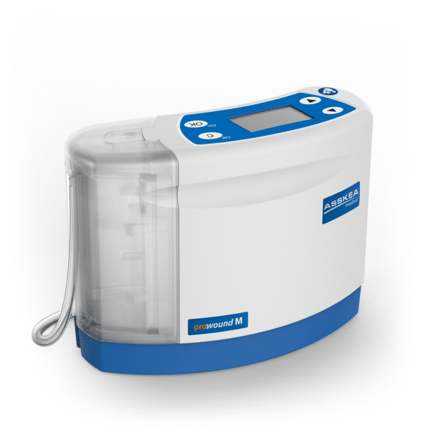 De draagbare Asskea Prowound® M biedt alle voordelen van NPWT zonder pijn en ongemak voor de patiënt. Lichtgewicht en discreet. De Prowound® M is draagbaar en comfortabel zodat uw ambulante patiënten, gedurende de thuiszorg, hun dagelijks activiteiten kunnen voortzetten.