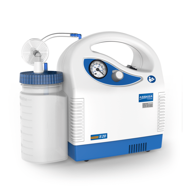 De ASSKEA S20 vacuümpomp biedt de gebruiker een medische zuigpomp voor tijdelijke- en bij voorkeur spontane aspiratie van afscheidingen, lichaamsvloeistoffen en spoelvloeistoffen. Bijzonder opmerkelijk is de eenvoudige bediening van de mobiele aspirator, die zeer betrouwbaar en bijzonder veilig gebruik garandeert. Door het eenvoudige en overzichtelijke bedieningsontwerp met behulp van een vacuümmeter en een extra luchtregeling is het compacte ontwerp van de mobiele, analoge aspirator S20 indrukwekkend.