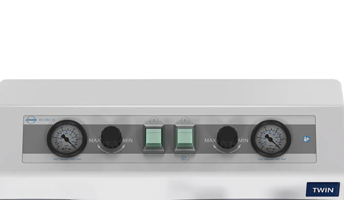 De twee chirurgische zuigers kunnen flexibel worden ingezet volgens de vereisten. De twee afzonderlijke pompen kunnen individueel of tegelijkertijd worden gebruikt, elk met verschillende gewenste vacuümwaarden. Het is mogelijk om een lager vacuüm in het operatieveld te hebben, bijvoorbeeld om weefsel te beschermen, en een hoger vacuüm voor het afzuigen van de vloer. Bestaande vloerafzuigingstoebehoren kunnen eenvoudig worden aangesloten op de ATMOS Twin Record 55 via een slang.