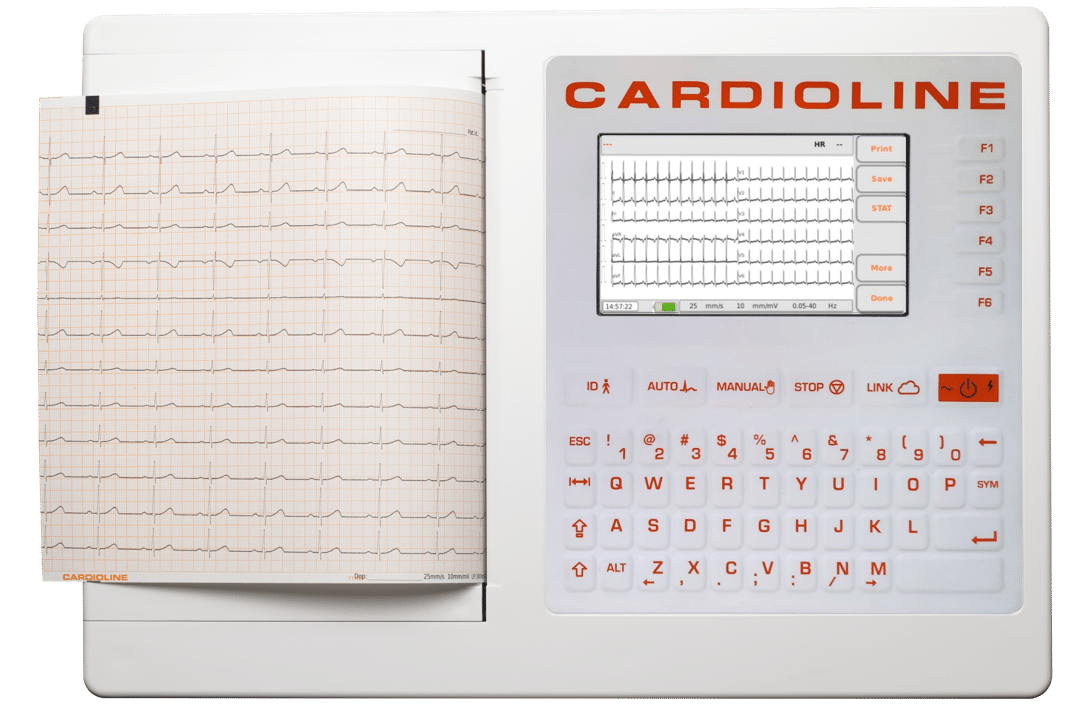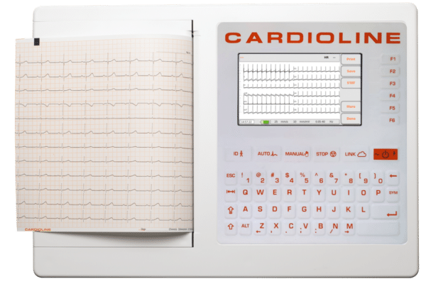Cardioline ECG200+ bovenaanzicht, rust ecg, 12 kanaals ecg met A4 printer en toetsenbord