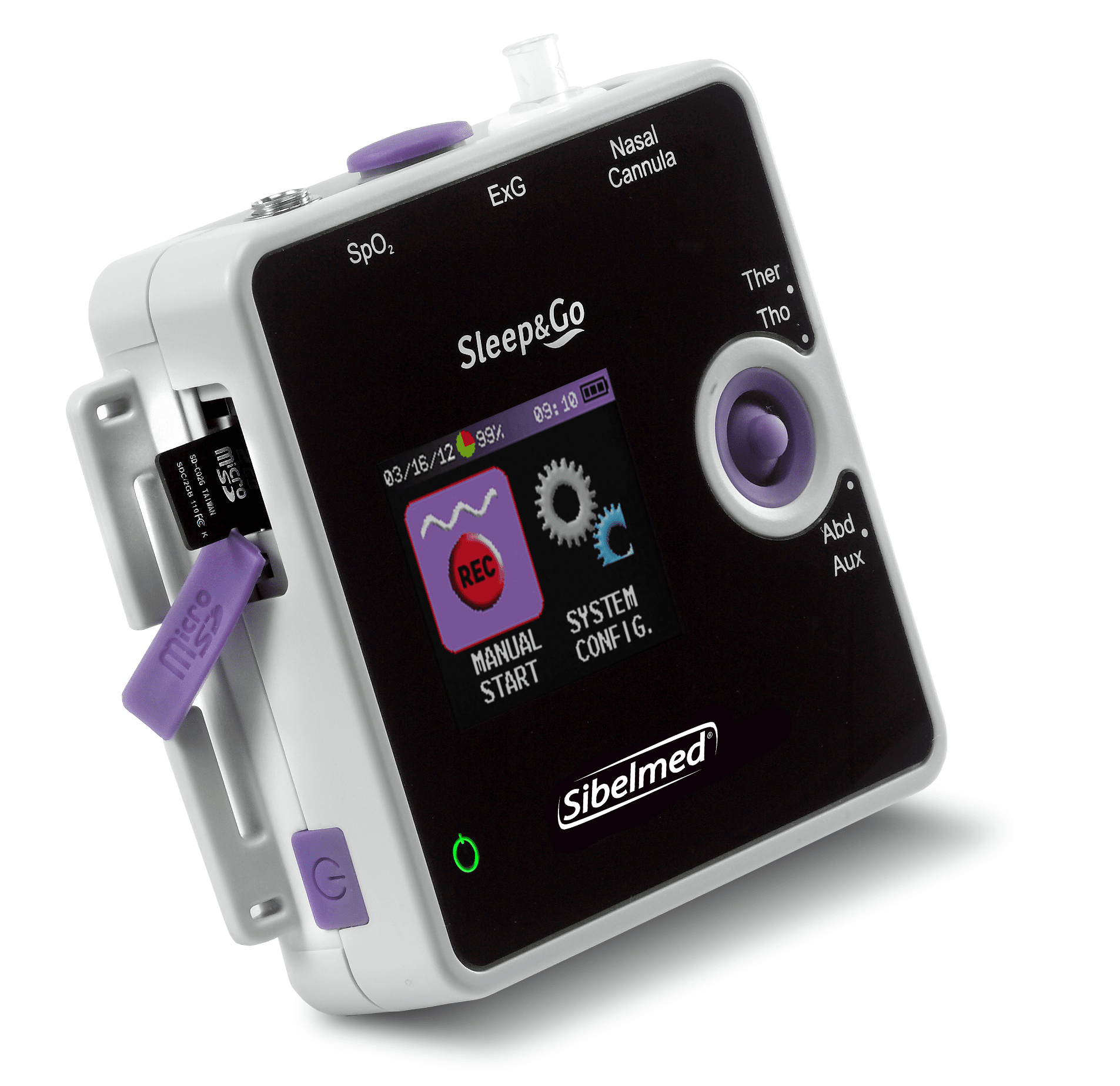 • Sleep&Go Configuratie A: Inclusief Sleep&Go-apparaat, neuscanule voor luchtstroom en snurken, SpO₂, hartslag, polsgolf, positie- en activiteitskanaal, thoracale inductieve band.